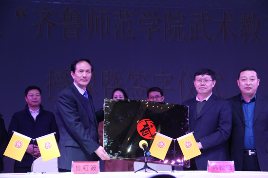 此次儀式由武術(shù)館副館長陳俊杰任主持。齊魯師范學(xué)院校長林松柏、少林寺武術(shù)館館長焦紅波、新華睿聯(lián)(北京)企業(yè)管理有限公司總經(jīng)理李興亮代表三方共同簽署合作協(xié)議,齊魯師范學(xué)院分別向武術(shù)館、新華睿聯(lián)分別授以“齊魯師范學(xué)院武術(shù)教育實踐基地”的牌匾。