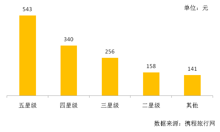 2018年河南“五一”假日期間,五星級酒店的平均價格為543元,較平時增長27元;四星級酒店的平均價格為340元,較平時增長38元;三星級酒店的平均價格為256元,較平時增長42元;二星級平均價格為158元,較平時增長30元;其他類型酒店的平均價格為141元,較平時增長25元。“五一”假日期間,以三星級酒店為代表的中端酒店上漲幅度最大,最受市場歡迎。