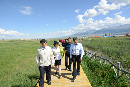 河南省旅游局副局長周耀霞(左二)在高家湖濕地公園現(xiàn)場指導(dǎo)景區(qū)建設(shè)