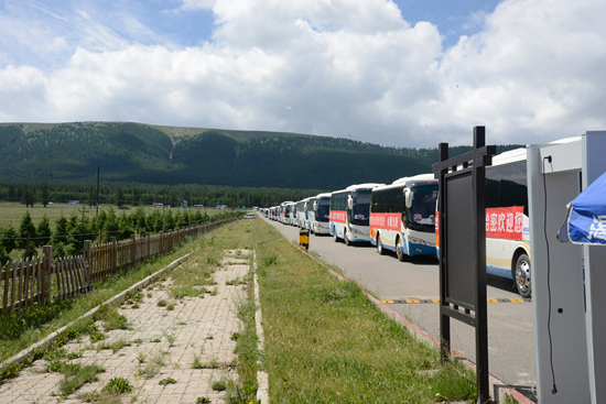 數(shù)十輛滿載河南游客的旅游大巴緩緩駛?cè)氚资^景區(qū)