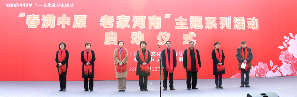 1月12日上午,鄭州市紫荊山公園廣場(chǎng)主會(huì)場(chǎng),“春滿(mǎn)中原 老家河南”主題系列活動(dòng)在一曲廣場(chǎng)舞《出彩新河南》中拉開(kāi)序幕。河南省委常委、宣傳部部長(zhǎng)趙素萍,河南省人民政府副省長(zhǎng)戴柏華,河南省委宣傳部副部長(zhǎng)張曼如,河南省人民政府副秘書(shū)長(zhǎng)黃東升,河南省文化和旅游廳黨組書(shū)記宋麗萍,河南省文化和旅游廳巡視員康潔,鄭州市人民政府副市長(zhǎng)孫曉紅,中國(guó)古都學(xué)會(huì)名譽(yù)會(huì)長(zhǎng)、鄭州大學(xué)歷史學(xué)院院長(zhǎng)劉慶柱出席啟動(dòng)儀式。河南省文化和旅游廳副廳長(zhǎng)周耀霞主持啟動(dòng)儀式。
