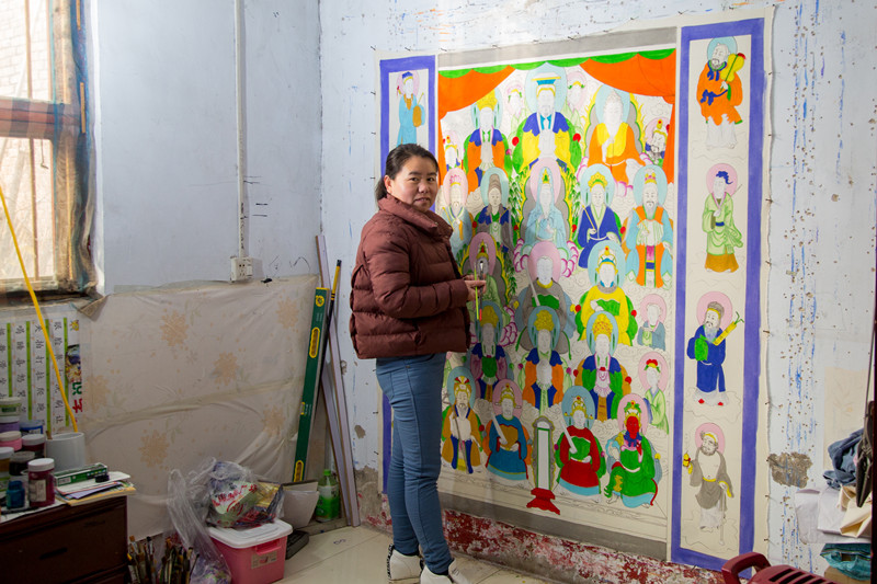 我是濮陽市市級非遺保護(hù)項(xiàng)目宋氏撲灰神像年畫第五代傳承人。由于出生在畫匠世家,我從小耳濡目染,七歲開始學(xué)習(xí)畫畫。一開始,家族手藝是傳男不傳女的,但由于時代的變遷,一些傳統(tǒng)技藝開始衰退、流失,家里人也漸漸改變了觀念。1995年我的爺爺去世后,我便承擔(dān)起傳承手藝的重任。那段時間,我一邊練習(xí)繪畫,一邊了解人類起源的文化解釋等民俗知識,參加附近各地廟會了解民俗民情,還要跟客戶講解撲灰年畫的藝術(shù)淵源、神像類別、有哪些禁忌等。