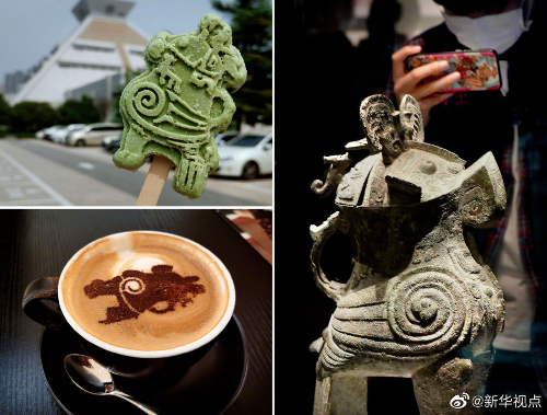 拼版照片:右圖為2020年9月24日,參觀者在河南博物院主展館內(nèi)拍攝展品“婦好鸮尊”;左上圖為2020年9月24日拍攝的河南博物院推出的“婦好鸮尊”冰淇淋;左下圖為2020年9月24日拍攝的河南博物院推出的“婦好鸮尊”圖樣咖啡。新華社發(fā)