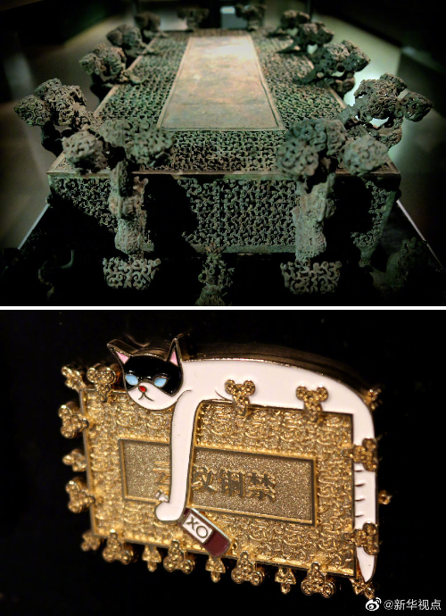 上圖為2019年11月18日拍攝的河南博物院展出的“云紋銅禁”;下圖為河南博物院推出的“云紋銅禁”文創(chuàng)產(chǎn)品(資料照片)。新華社發(fā)