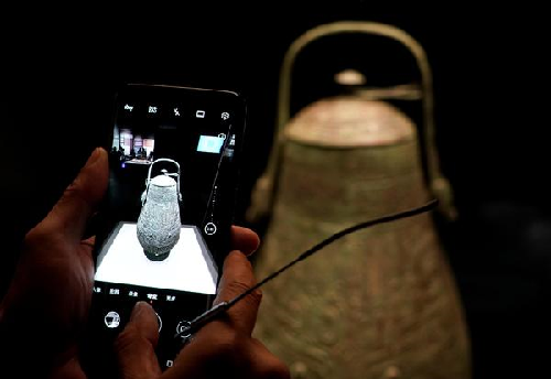 9月24日,參觀者在河南博物院主展館內(nèi)拍攝展品“獸面紋提梁銅卣”。新華社發(fā)