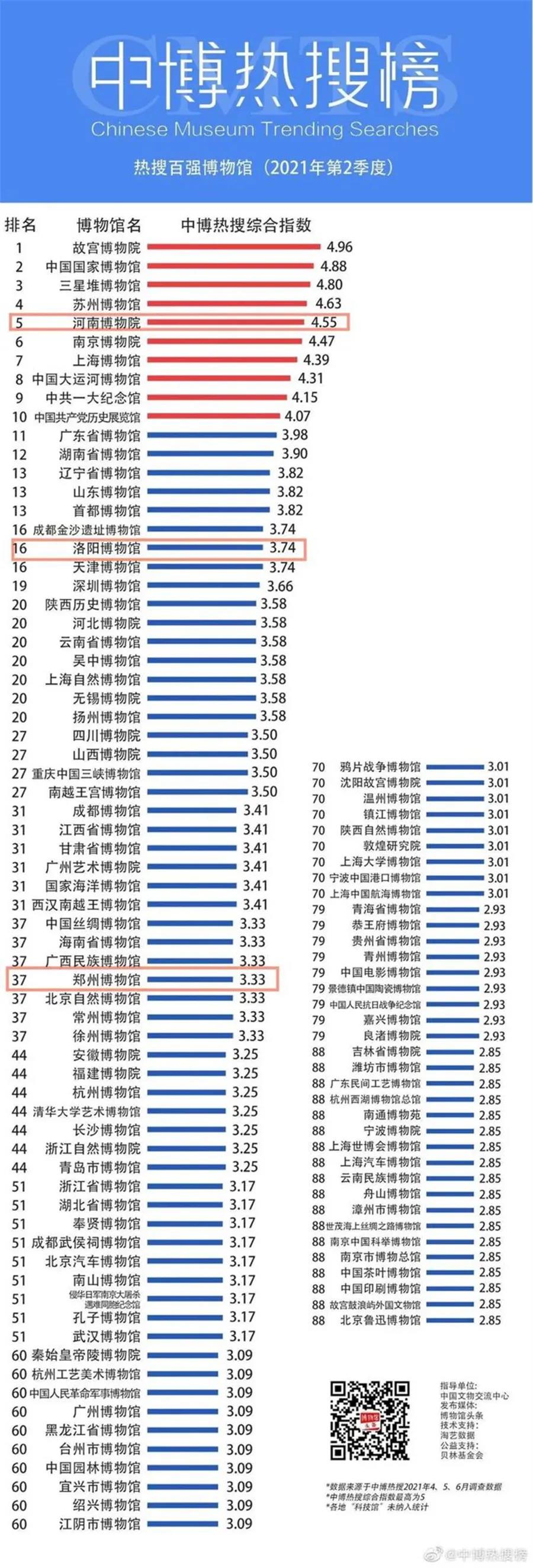 中博熱搜榜近日發(fā)布2021年第二季度全國(guó)熱搜博物館百?gòu)?qiáng)榜單,105家受到網(wǎng)友高頻搜索的博物館上榜,河南有3家博物館位列其中。