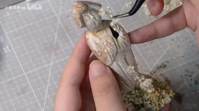 隨即,她將仕女俑細心粘好,按修復步驟用膠條捆好固定,等待干燥。等待的過程中,“小魚殺手uu”繼續(xù)發(fā)揮創(chuàng)意,用之前包裹陶片的泥土塑了一個底座,粘上細碎的干花,然后用軟陶泥另外捏了一個迷你仕女,將其粘在之前特意留出的小洞里,制造出一幅“仕女俑上的仕女賞花”立體圖,令觀看者稱贊不已。