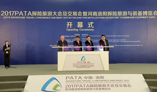 4月2日,2017(PATA)亞太旅游協(xié)會探險旅游大會及交易會暨河南洛陽探險旅游與裝備博覽會在洛陽市新區(qū)會展中心隆重開幕。國家旅游局副局長魏洪濤,國家旅游局旅游促進(jìn)與國際合作司副司長張西龍,亞太旅游協(xié)會主席安德魯•瓊斯,亞太旅游協(xié)會首席執(zhí)行官馬里奧•哈迪,亞太旅游協(xié)會首席運(yùn)營官戴爾•勞倫斯,聯(lián)合國世界旅游組織市場趨勢項(xiàng)目組技術(shù)協(xié)調(diào)專員米歇爾•朱利安,中國東盟中心教育文化旅游部主任孔如夢,河南省委常委、洛陽市委書記李亞,河南省人民政府副省長舒慶,河南省人民政府副秘書長萬旭,洛陽市人民政府市長劉宛康,河南省旅游局副局長周耀霞,省政府外僑辦副主任郭俊峰,洛陽市委常委、秘書長楊廷俊,洛陽市人民政府副市長魏險峰、洛陽市人民政府副市長侯占國出席開幕式。來自亞太旅游協(xié)會部分會員國家、地區(qū)和城市代表,部分省、直轄市、自治區(qū)和重點(diǎn)旅游城市旅游部門負(fù)責(zé)人以及國內(nèi)外旅游專家、旅行商、探險旅游裝備展銷商負(fù)責(zé)人參加開幕式。開幕式由河南省旅游局局長寇武江主持。
