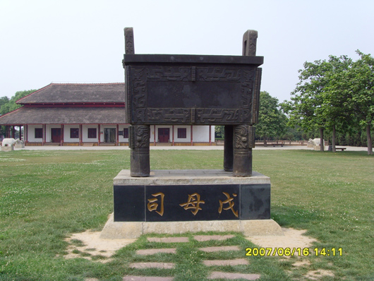 殷墟王陵區(qū)出土的司母戊大鼎在世界上最負盛名的青銅禮器,高達133厘米, 口長79.2厘米,重量達875公斤, 是至今世界上發(fā)現(xiàn)最大的銅器鼎。原件藏中國歷史博物館。殷墟博物苑為便于游人參觀,將其仿制放大露天陳列在大殿前的廣場上。此鼎造型龐大雄渾,紋飾精美細膩,是中國青銅器文化中的瑰寶,美術(shù)史上的璀璨明珠,為“世界之最”。其鑄法先進,青銅器配方之科學(xué),令當今冶金專家為之嘆服!鑄造這樣的重器,需要高度的技藝和組織勞動的經(jīng)驗。已有不少學(xué)者指出,這件巨大的青銅方鼎反映了商代奴隸制的發(fā)達和人民高度的創(chuàng)造能力。