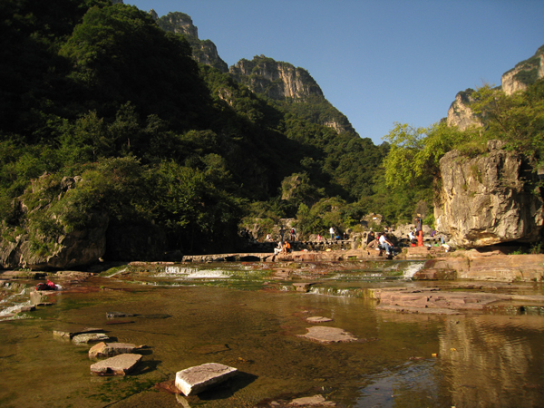 紅石河位于八里溝盡頭葫蘆崖上,源出山西,河寬20米,深0.6米,由于海拔1500米,故又叫“太行天河”。山谷幽深,流水潺潺,河水順著光潔平整、錯(cuò)落有致的紅石板川流不息。河邊有一天然石洞,名青龍洞。三伏天里涼氣沁人。此洞泉水常年不斷,水色透明,無(wú)氣味,無(wú)雜質(zhì),含多種益于健康的多種微量元素。山谷有一巨石,站在石壁下靜聽,可以聽到潺潺流水之聲,或游人談話之聲,叫“回音壁”。北邊山上有一山谷,山泉涌出,從山巖上落下,如珠如玉,似針?biāo)凭,一串串,一行行,故名“珍珠泉”。最后一個(gè)景點(diǎn)處有一山峰巨石,遠(yuǎn)看如南海觀音,近看一石縫分開兩石,就是“一線觀音”了。