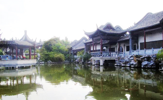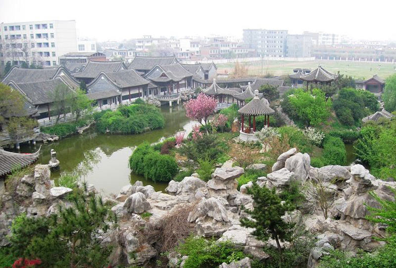 百花洲位于書院東側(cè),緊臨鄧州保存最完好的一段明代古土城墻。百花洲由謝絳在1039年任知州時辟建,后由范仲淹修建成書院園林,有菊花臺、亭榭、太湖石點(diǎn)綴湖岸,島內(nèi)遍植花木,建筑采用范仲淹家鄉(xiāng)清代江南園林風(fēng)格。百花洲布局為南山北水,洲南由各具特色的峭壁假山、五峰山和別有洞天組成。別有洞天假山將南北隔離,洲北湖內(nèi)大小三島,島上再現(xiàn)范仲淹任知州時與民同樂的嘉賞亭及菊花臺等。湖島將全湖劃分為大小水面,洲東面為自然收放線的溪流,北端有石舫“香舟”,中段臨水有扇亭“月到風(fēng)來亭”。百花洲之南的賞石園以欣賞石欄、石景為主。賞石園北為五峰假山、五峰書齋和長廊、思范亭,別有洞天,形成一條完美的園林風(fēng)景線。