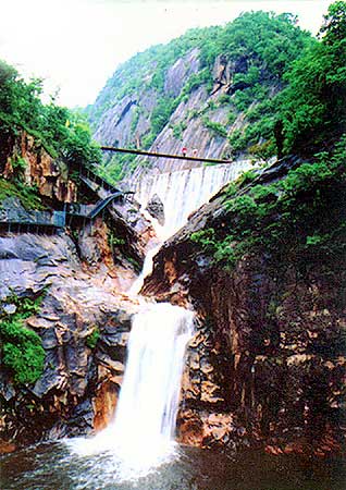 南陽五道幢生態(tài)游覽區(qū)位于西峽縣城東北部的二郎坪鄉(xiāng)境內(nèi),距縣城46公里,緊靠311國道和豫51省道。五道幢景區(qū)峽谷奇特,斷巖崢蠑,懸崖陡峭,鬼斧神工。谷中河水清澈,緩如垂練,急如拋珠,瀑瀉如注,轟鳴而下,山水相映相輝,如詩如畫;景區(qū)內(nèi),春天百花爭艷,盛夏滿山翠綠,金秋萬山紅遍,嚴(yán)冬銀裝素裹:北臨刀棱山峭壁,東與馬武寨奇峰相連,西、南和黃花墁上的天然韭菜園接壤,四周秀山起伏,景點連線,風(fēng)光無限。懸崖建棧道,峭壁有攀巖,峽谷有速降,吊橋空中懸,小橋伴流水,五幢勝景,各有于秋,景區(qū)內(nèi)共有各類不同景點40多處;游客能參與、體驗在其中;是一個集探險、娛樂、觀光、休閑,避暑、度假、科教、強身健體為一體的綜合旅游勝地。