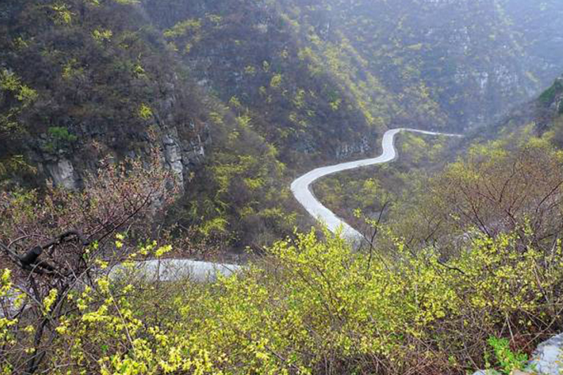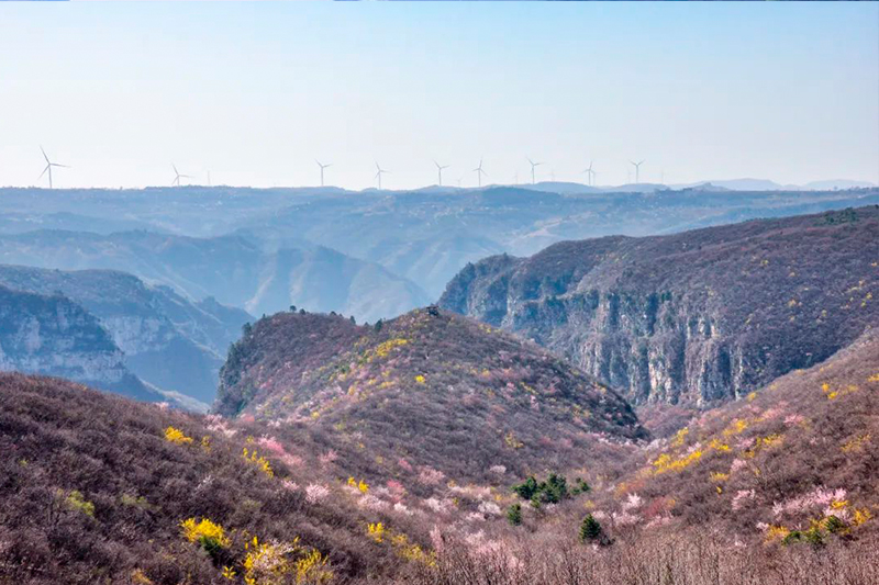 陽春三月,站在賞花棧道遠(yuǎn)遠(yuǎn)望去,粉黃相間的色彩,使得巍峨的山脈更多了些柔情。
