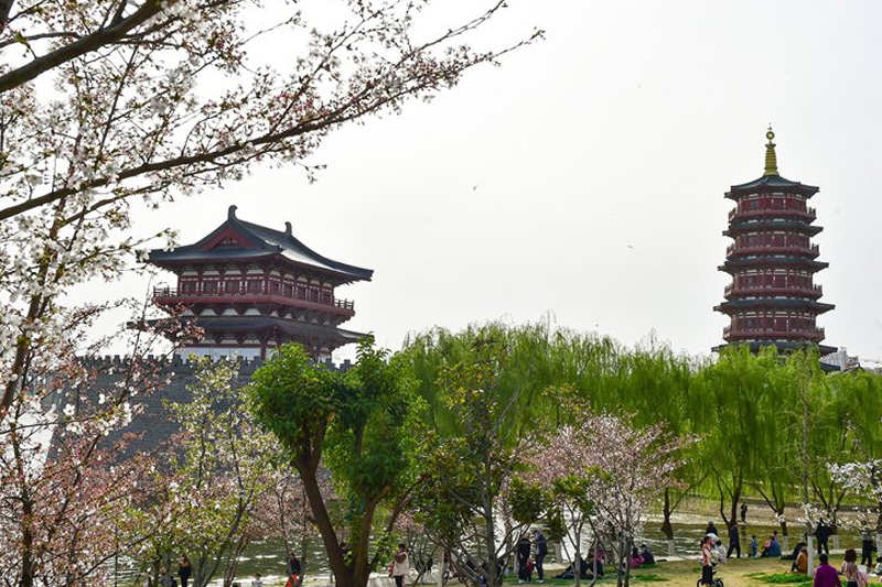 市民在河南洛陽市瀍河區(qū)朱櫻塔景區(qū)休閑游玩。