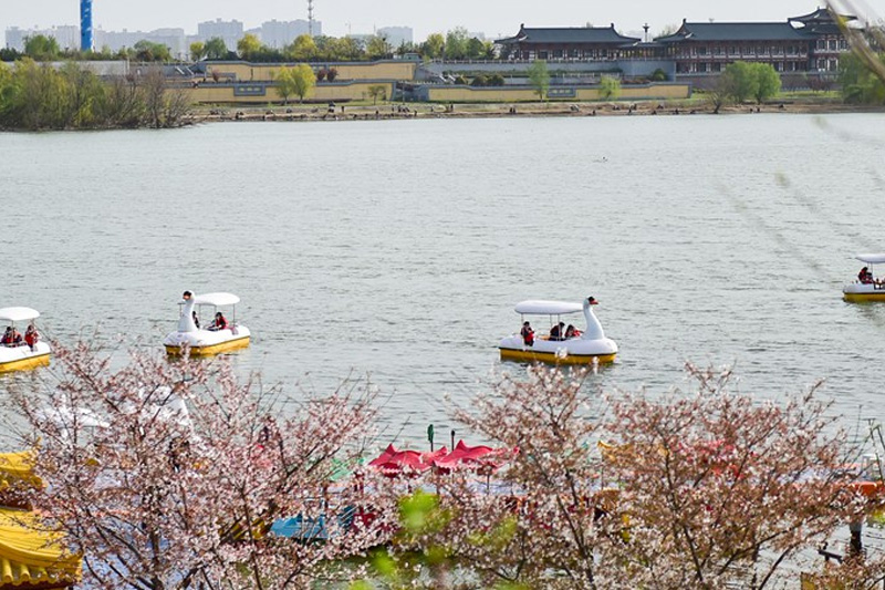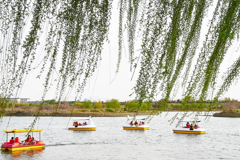 市民在河南洛陽市瀍河區(qū)朱櫻塔景區(qū)洛河內(nèi)劃船游玩。