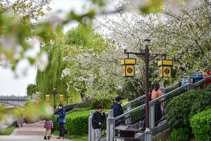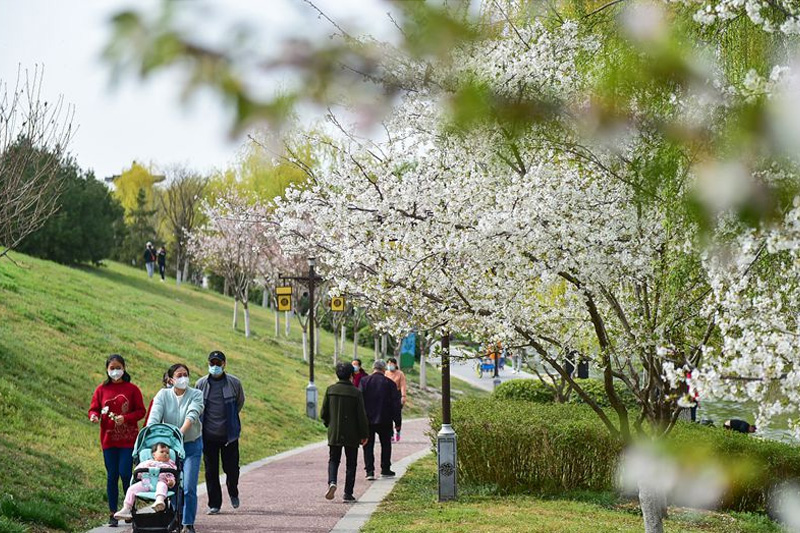 氣溫升高,天氣漸暖。近日,在古都河南洛陽的洛河和瀍河兩岸,柳樹抽芽,櫻花、海棠爭相競放,與古建交相映襯,生機盎然。市民漫步其間,沐浴春日陽光,盡享古都美景。