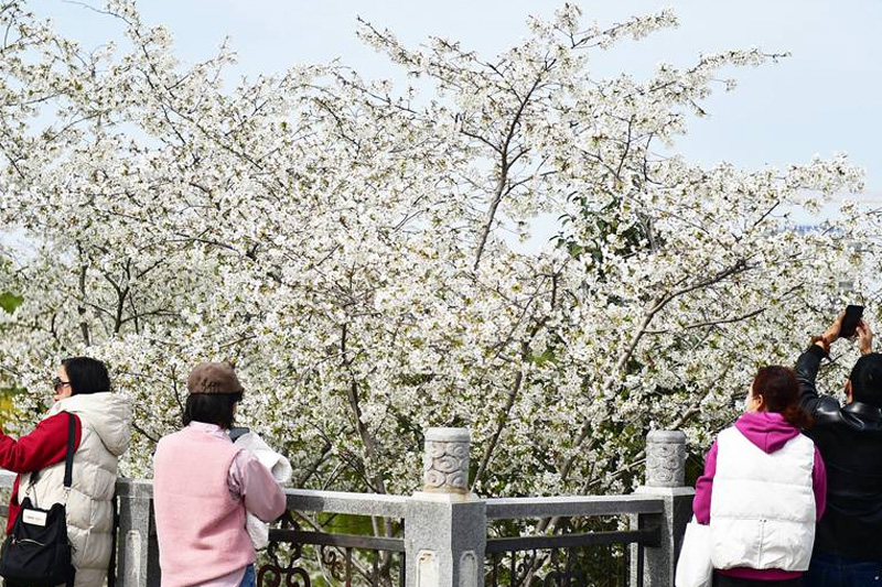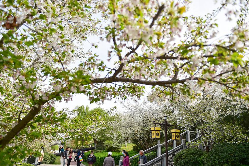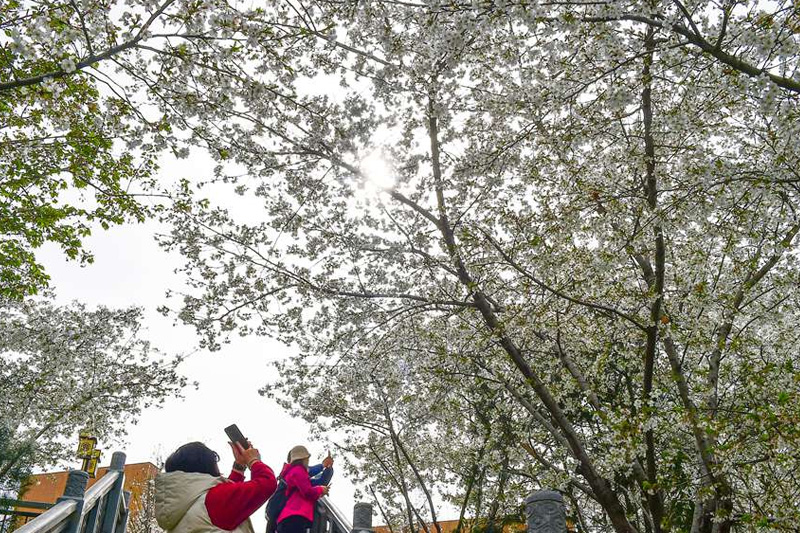 市民在河南洛陽市瀍河區(qū)朱櫻塔景區(qū)欣賞盛開的櫻花。