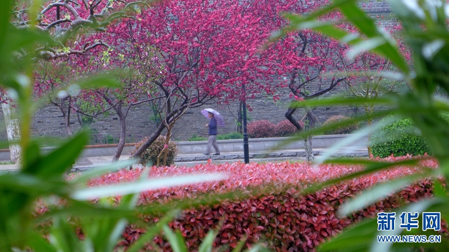4月3日,一名游客冒雨在河南省開封市環(huán)城墻公園賞景。