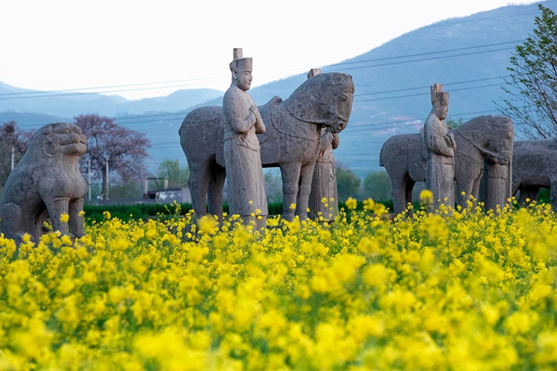 武士像威猛高大,動物像栩栩如生,歷經(jīng)千年風(fēng)雨,風(fēng)采依舊。在花海之中呈現(xiàn)出別樣的溫柔,吸引著市民慕名而來拍照打卡。