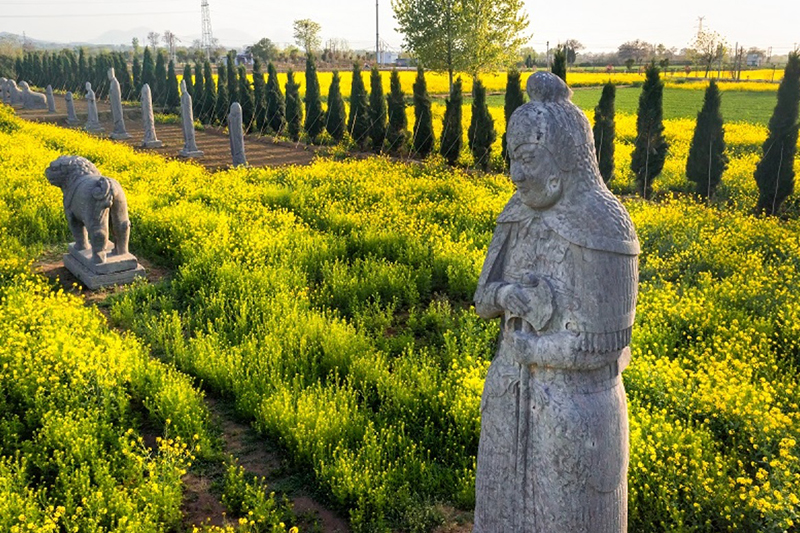 4月8日,鞏義北宋皇陵保護(hù)區(qū)內(nèi),油菜花正在綻放,神道石像生安靜矗立其中。