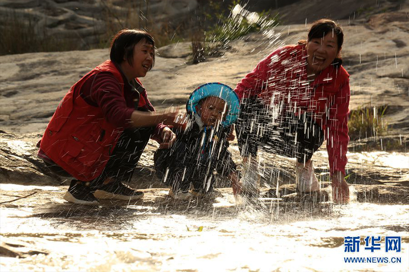 4月8日,在豫鄂兩省交界桐柏山脈的抱樸谷康養(yǎng)旅游區(qū),游客在桃花潭瀑布邊戲水。