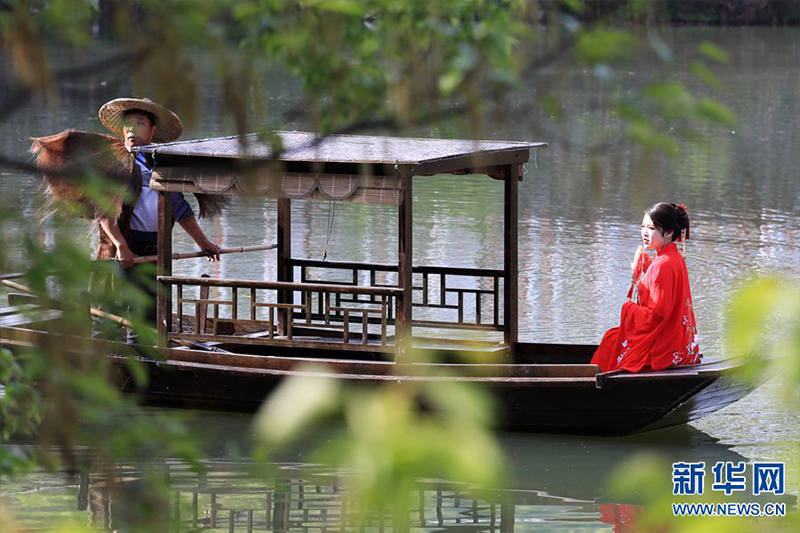 4月8日,在豫鄂兩省交界桐柏山脈的抱樸谷康養(yǎng)旅游區(qū),游客在乘船游玩。