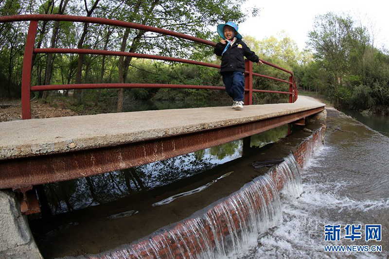 4月8日,在豫鄂兩省交界桐柏山脈的抱樸谷康養(yǎng)旅游區(qū),一位小朋友在開(kāi)心游玩。