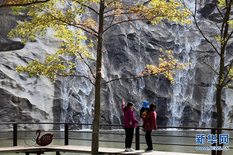 4月6日,在豫鄂兩省交界桐柏山脈的抱樸谷康養(yǎng)旅游區(qū),游客在桃花潭瀑布游玩。