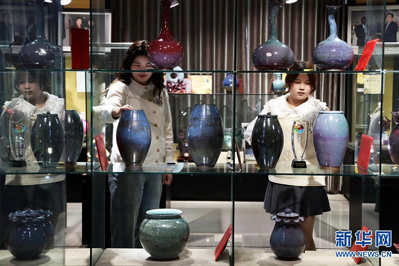 4月12日,在河南省禹州市神垕古鎮(zhèn)坪山鈞窯,游客在參觀展出的鈞瓷作品。