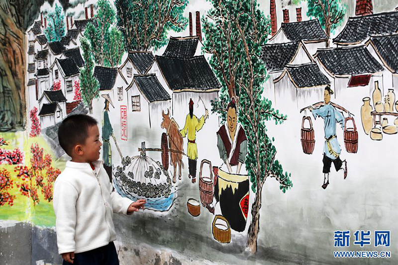 4月12日,在河南省禹州市神垕古鎮(zhèn)坪山鈞窯,一位兒童在觀看鈞瓷制作技藝壁畫。