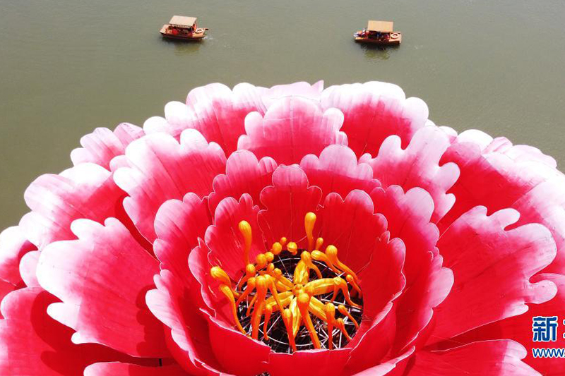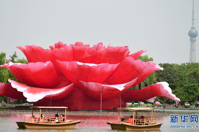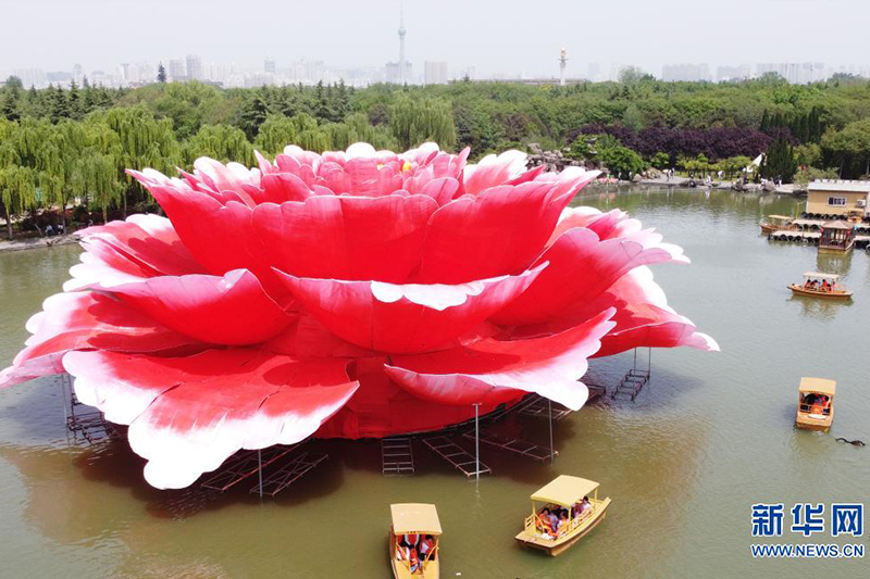 近日,在河南省洛陽市隋唐城遺址植物園,一座直徑36米、高13米的巨型牡丹景觀造型亮相滴翠湖,吸引游客前來觀賞。