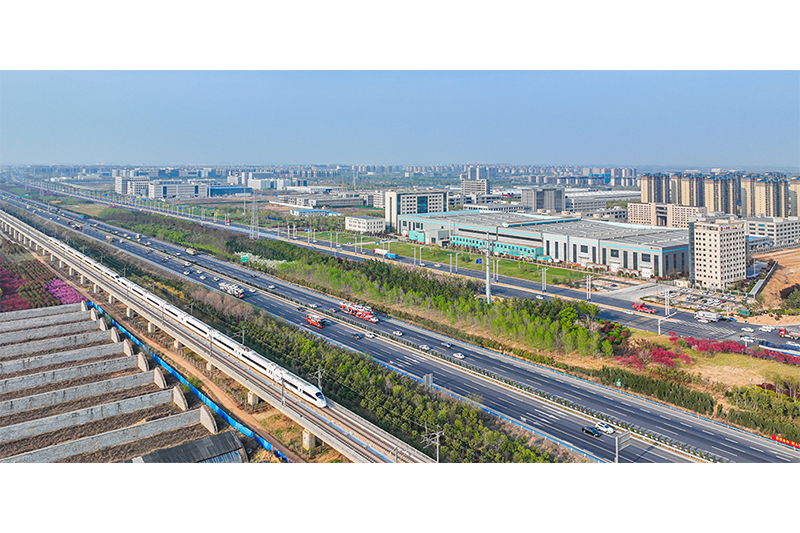 便捷的高速路網(wǎng)、城市道路也在這片土地匯聚。華夏大道旁,列車正行駛通過。劉暢 攝