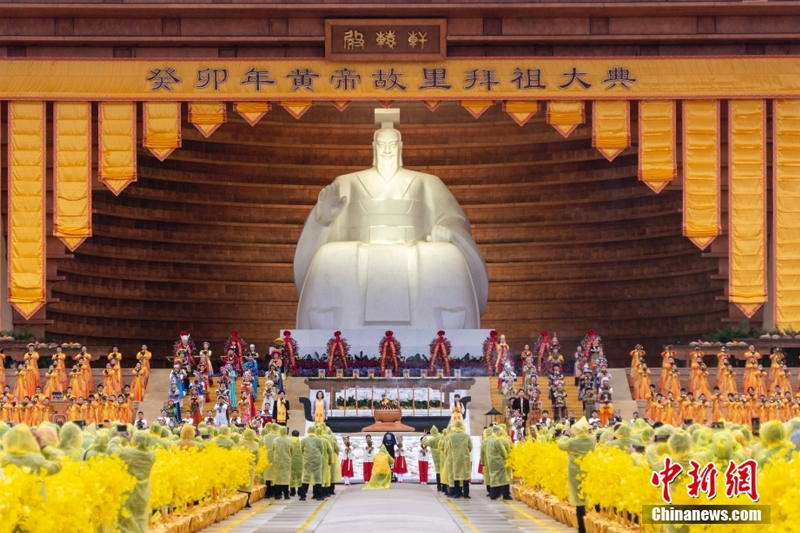 4月22日,河南新鄭,癸卯年黃帝故里拜祖大典在雨中如期舉行。來自海內(nèi)外的華夏兒女冒雨祭拜人文始祖黃帝。圖為大典現(xiàn)場。