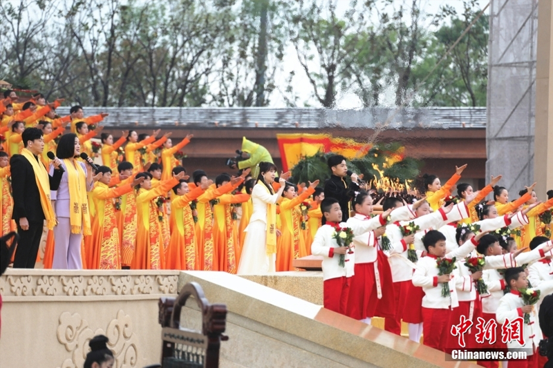 4月22日,河南新鄭,癸卯年黃帝故里拜祖大典在雨中如期舉行。來自海內(nèi)外的華夏兒女冒雨祭拜人文始祖黃帝。圖為拜祖大典“高唱頌歌”環(huán)節(jié)。
