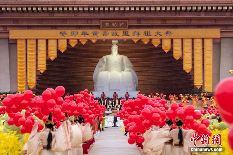 4月22日,河南新鄭,癸卯年黃帝故里拜祖大典在雨中如期舉行。來自海內(nèi)外的華夏兒女冒雨祭拜人文始祖黃帝。圖為拜祖大典“天地人和”環(huán)節(jié)。