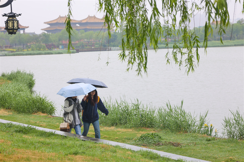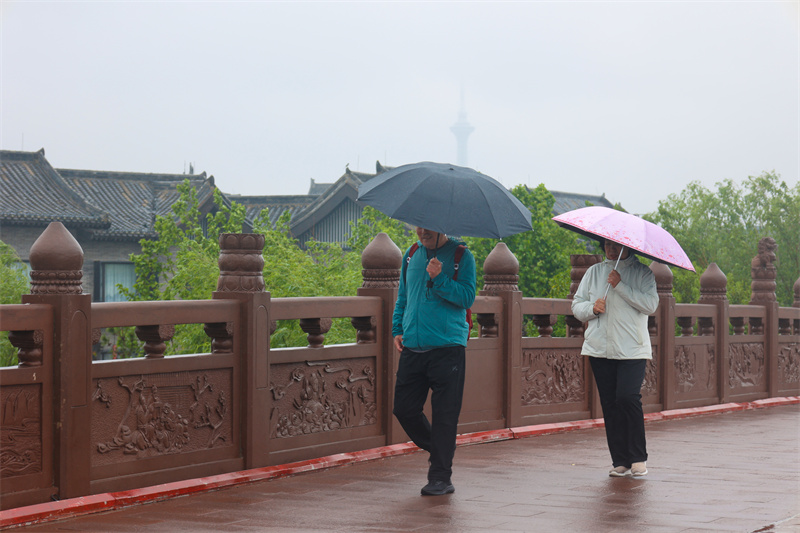 4月23日,雨中的古城靜謐祥和、韻味十足,游客在雨中撐傘慢游,如詩如畫。