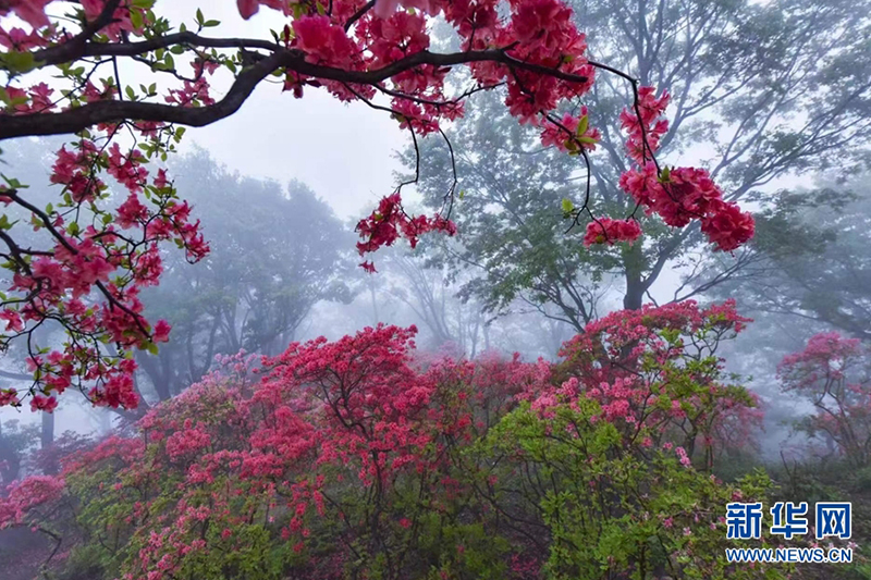 近日,在河南省南陽市桐柏縣桐柏山淮源風(fēng)景名勝區(qū)內(nèi),漫山遍野的映山紅競(jìng)相綻放,頗為好看。