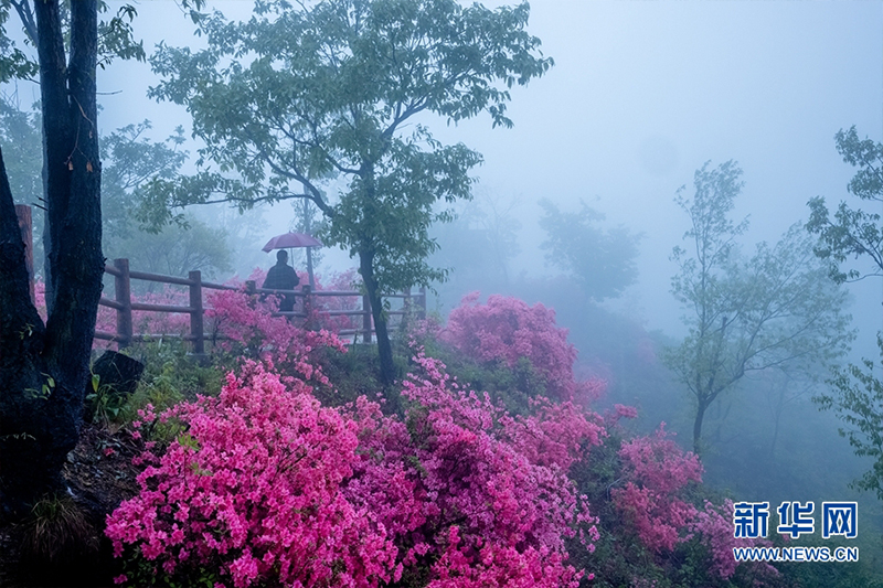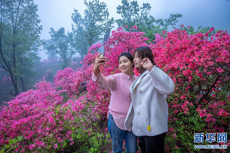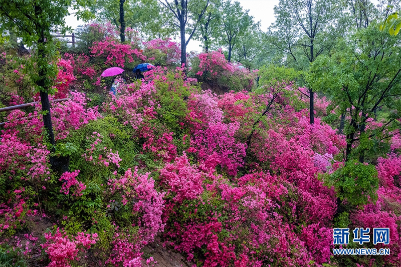 4月23日,河南省魯山縣四棵樹鄉(xiāng)平溝村,雨中的杜鵑花熱情綻放。