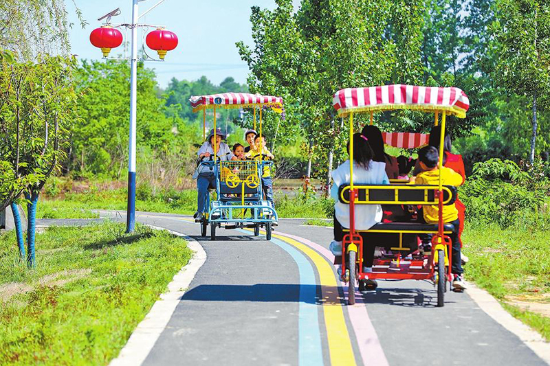 5月1日,游客在信陽(yáng)市光山縣孫鐵鋪鎮(zhèn)陳大灣村景區(qū)觀光游玩。“五一”假期,光山縣“鄉(xiāng)村游”火爆,游客來(lái)這里休閑放松,體驗(yàn)田園假期。謝萬(wàn)柏 攝