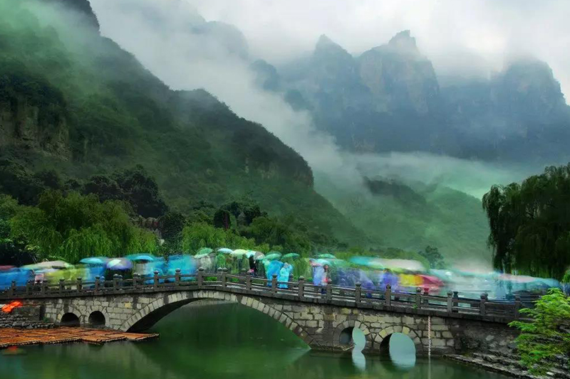 青山綠水、紅巖絕壁、云霧飄渺,在雨水的勾勒下構(gòu)成一幅素雅的山水畫,撐著花花綠綠的雨傘行走在峽谷間,和風(fēng)細(xì)雨為之良辰,最好的美景就是你。