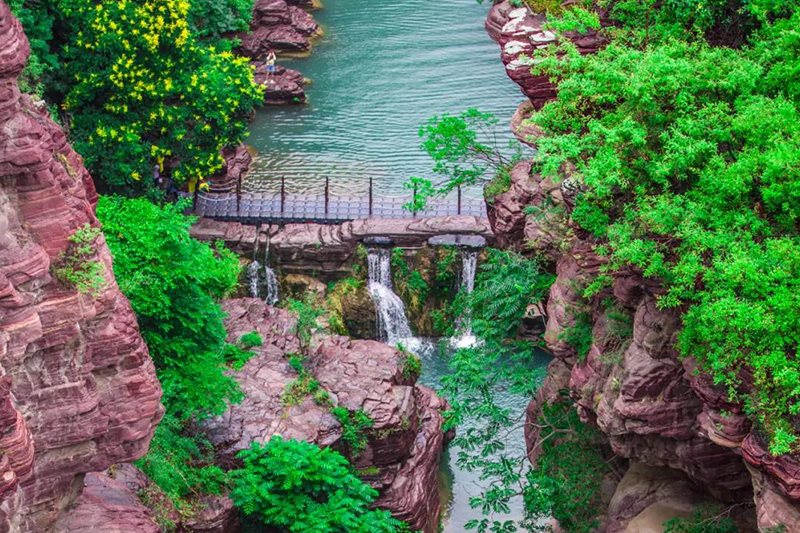 雨中的紅石峽,云霧緩緩纏繞在暗紅色的崖壁,在絲絲細(xì)雨的洗禮下顯得格外鮮艷奪目,呼吸著草木與泥土的氣息,耳畔是流水潺潺、細(xì)雨滴答……讓人一下子就沉醉其中。