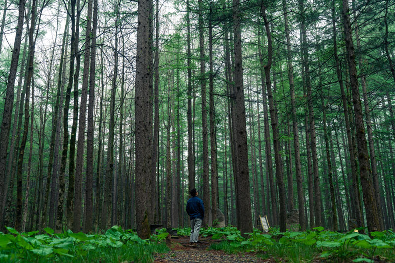 微微小雨不影響觀景,撐著一把傘漫步山中。