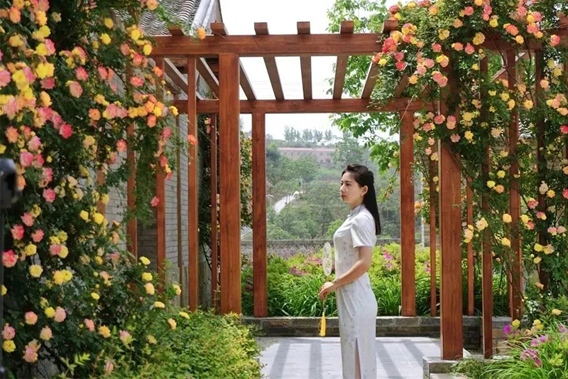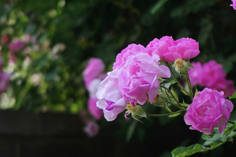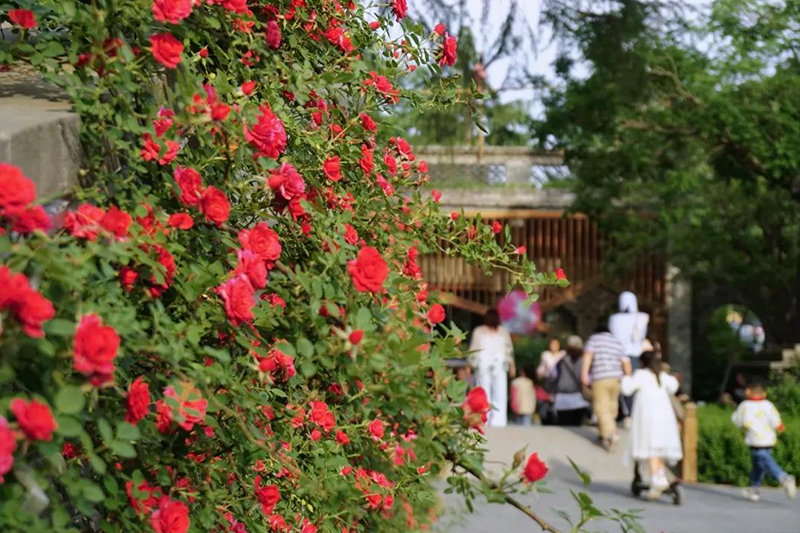 綻放的野薔薇、七姊妹、藤彩虹、木香花等,多種薔薇科植物,或懸垂于墻壁之側(cè),或攀爬于樹木灌叢之頂,蔓延成一道道壯觀的花墻。