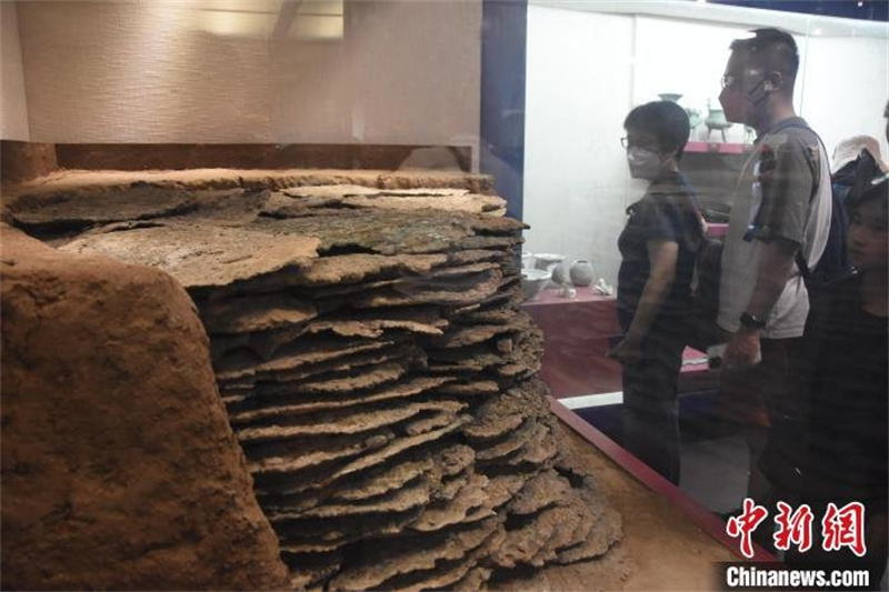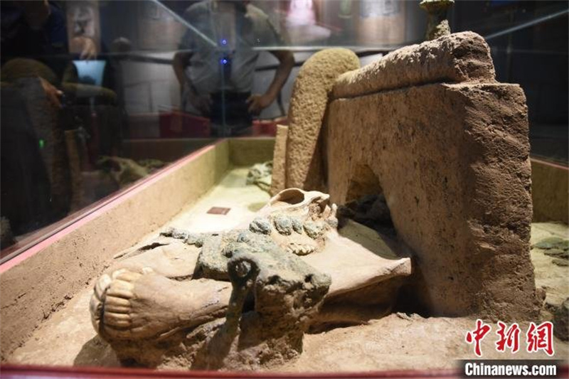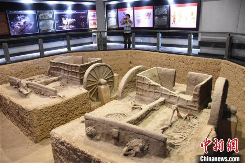 圖為殷墟博物館內(nèi)展出的車衡、車轅、馬頭與銅質(zhì)配飾。