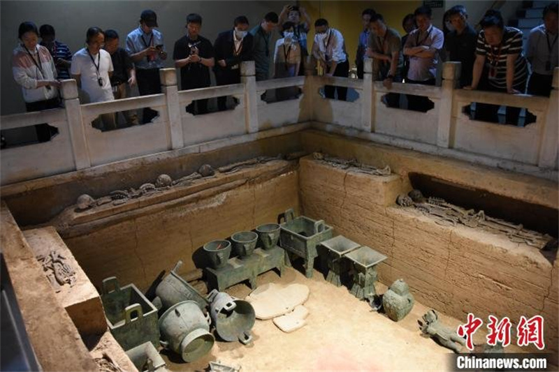 5月14日,“行走河南·讀懂中國”文明探源集中采訪活動(dòng)團(tuán),走進(jìn)河南省安陽市殷墟宮殿宗廟遺址和殷墟王陵遺址。殷墟是中國歷史上第一個(gè)文獻(xiàn)可考、為考古發(fā)掘所證實(shí)的商代晚期都城遺址。殷墟出土的甲骨文保存了3000年前的文字,把中國信史向上推進(jìn)了約1000年。圖為殷墟宮殿宗廟遺址根據(jù)甲骨文“門”的構(gòu)形和殷商紋飾設(shè)計(jì)的大門。