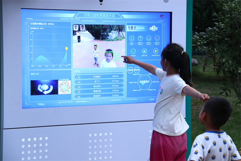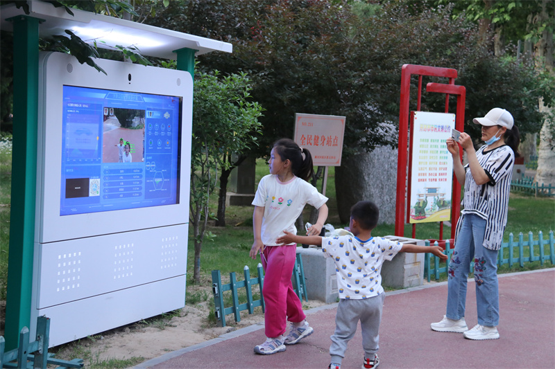 5月17日下午,在汴京公園的智能健身設(shè)備前,小朋友跟隨健身動作演示視頻做運動。據(jù)了解,該設(shè)備名為汴京公園智慧健身步道,是一款免費向市民提供科學(xué)運動建議和指導(dǎo)的智能化系統(tǒng)。