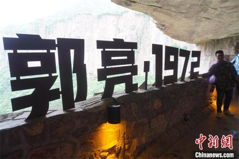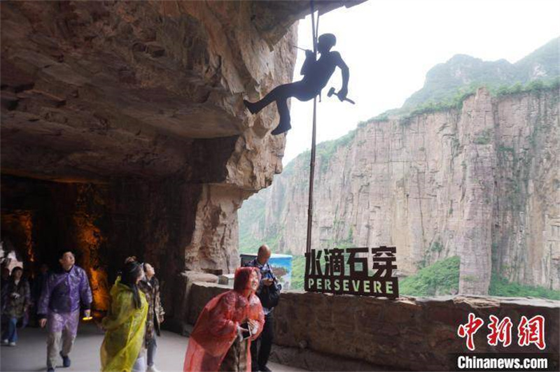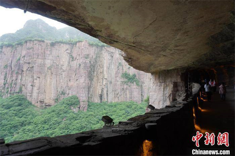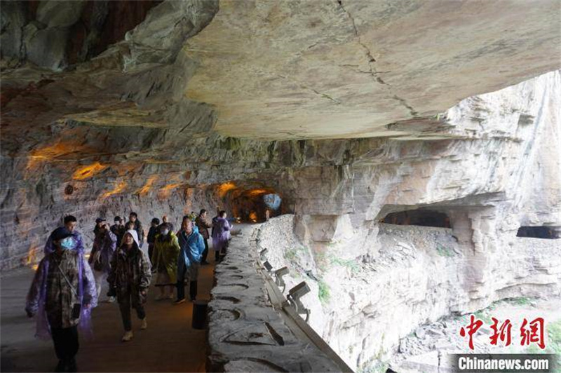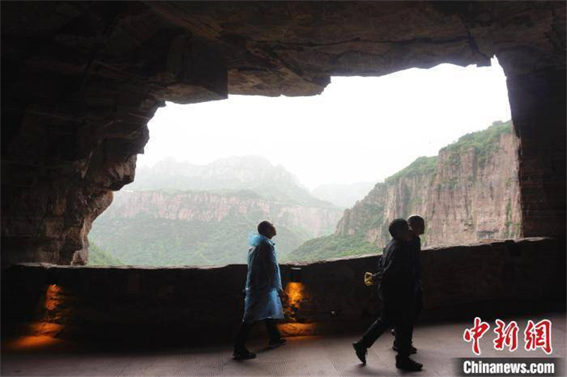 游客在郭亮村掛壁公路“郭亮洞”內(nèi)游覽。