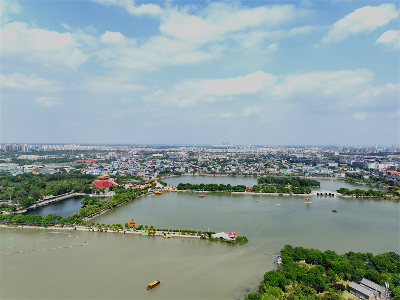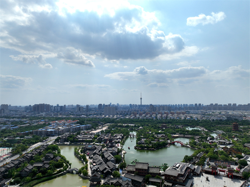 從空中俯瞰開封,綠樹成蔭,碧波蕩漾。在藍(lán)天白云的映襯下,古城顯得更美,更有韻味。