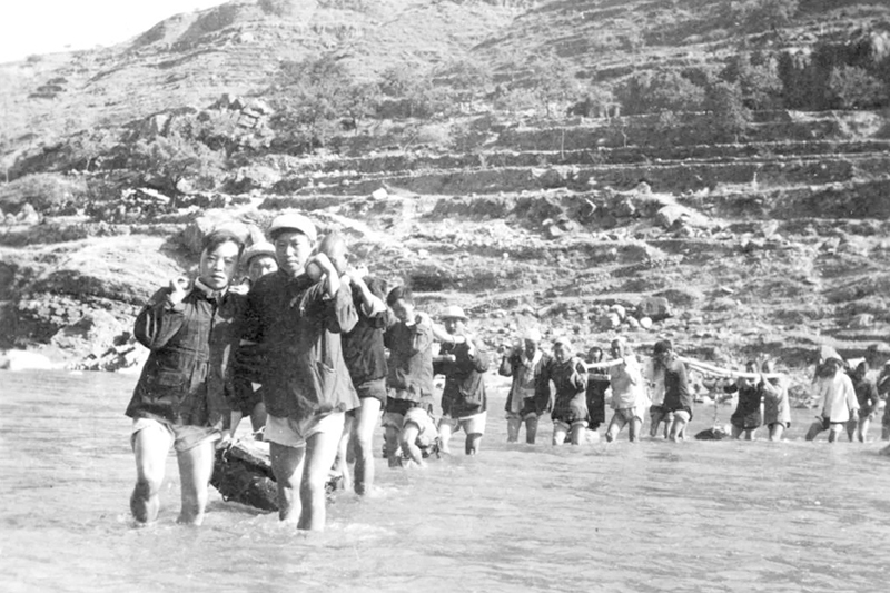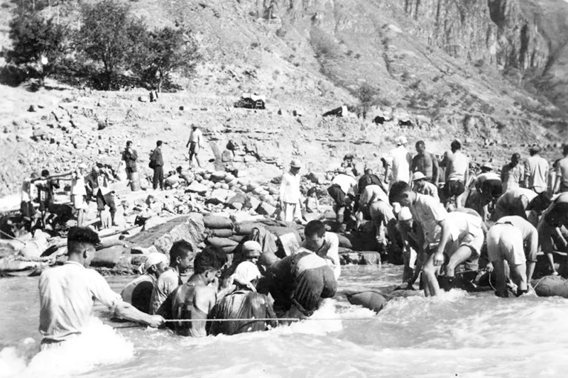 經(jīng)過認(rèn)真討論之后,40多名青年跳進(jìn)冰冷的急流,臂挽著臂、肩并著肩,用血肉之軀筑起了五道人墻方陣,像磐石一樣牢牢地釘在了河道中央,攔住了洶涌奔騰的激流。數(shù)百民眾蜂擁而上,抬石頭、背沙袋,在人墻方陣下游壘起一塊塊巨石,攔河大壩終于如期合攏。