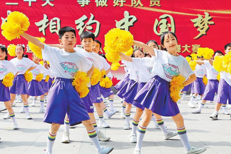 5月31日,溫縣城內(nèi)小學(xué)學(xué)生在參加集體舞比賽。 徐宏星 張倩 攝